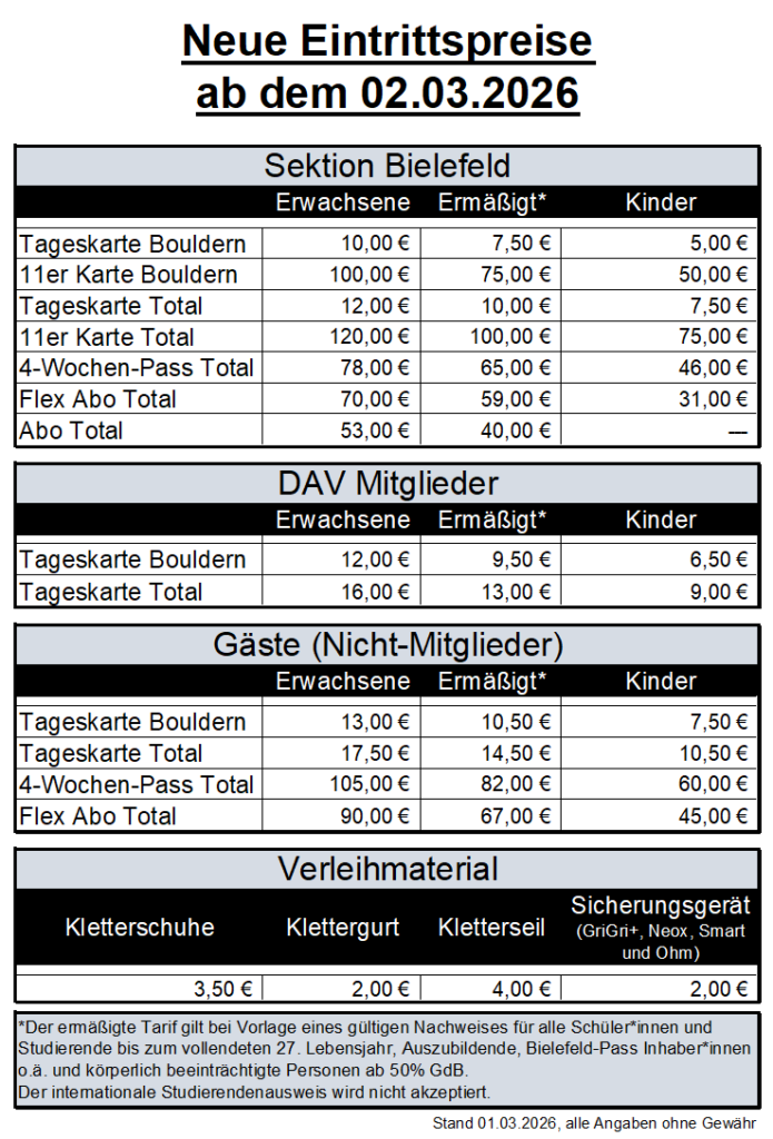 Neue Eintrittspreise ab dem 02.03.2026